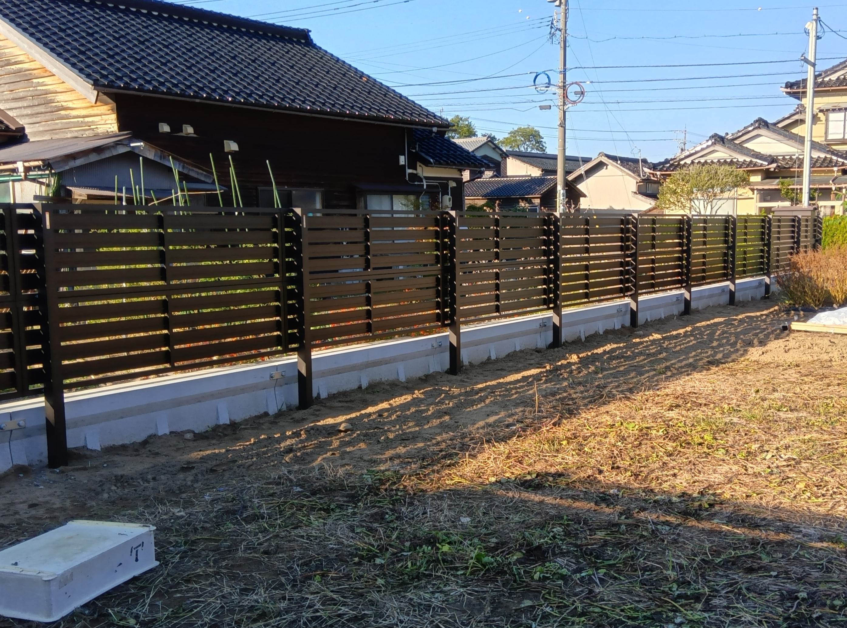 アルミ木調フェンス土間、杉苔張り、人工芝、フェンス設置